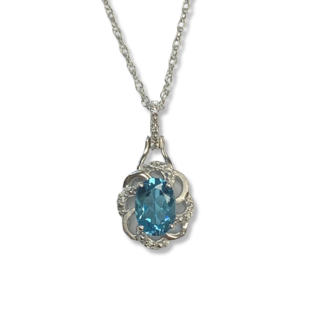 14K White Gold Blue Topaz Pendant with Diamond Accents on a 18″ Baby Rope
