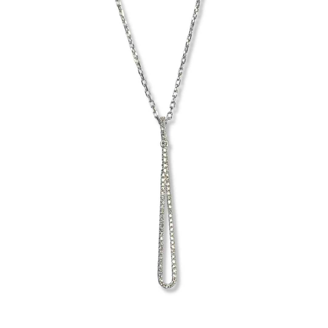 14K White Gold .17Ctw Diamond Elongated Drop 37mm long Pendant on a 16″ with 2″ Extension Beveled Oval Cable Chain