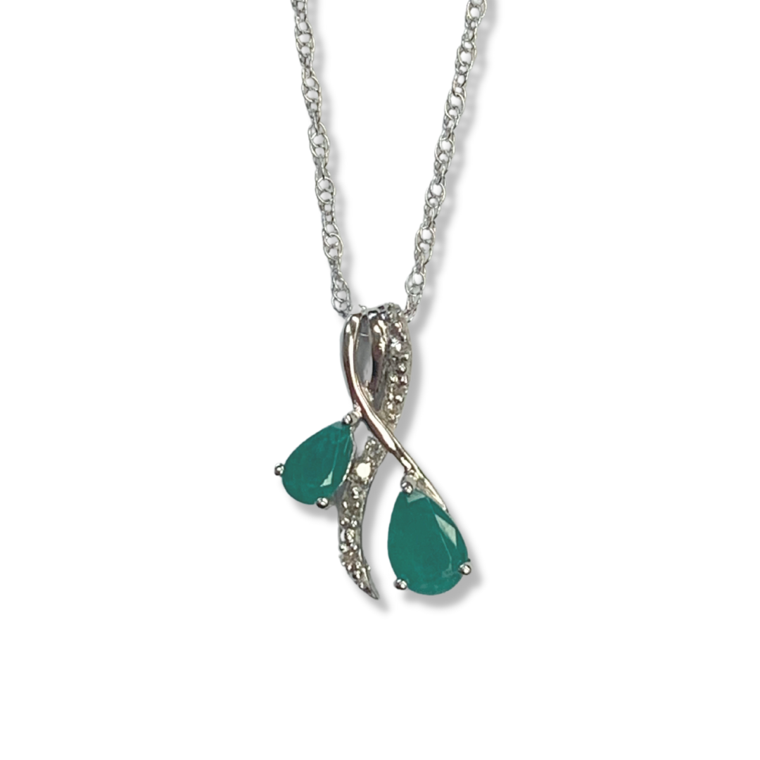 14K White Gold Genuine Emerald Pendant with Diamond Accent on a 18″ Baby Rope