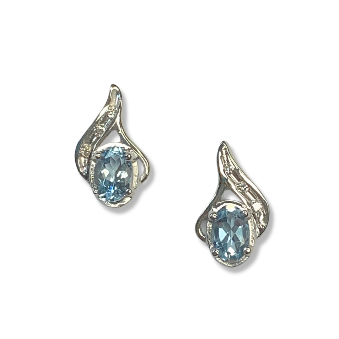 14K White Gold Oval Aqua Post Earrings with .06twt Diamond Accents