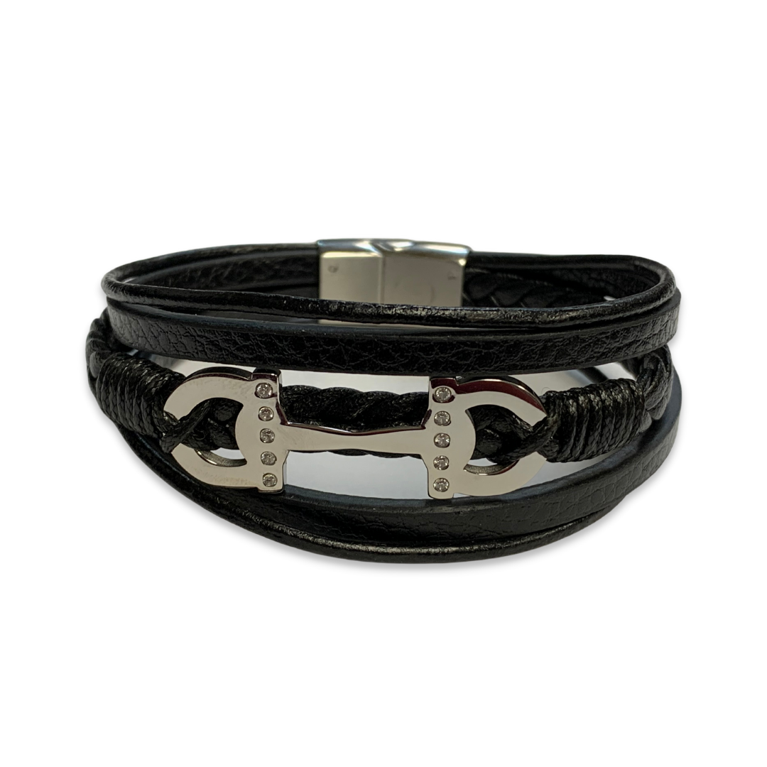 Black Leather Multi-Strand Bracelet Stainless Steel Charm with CZ accents 8″
