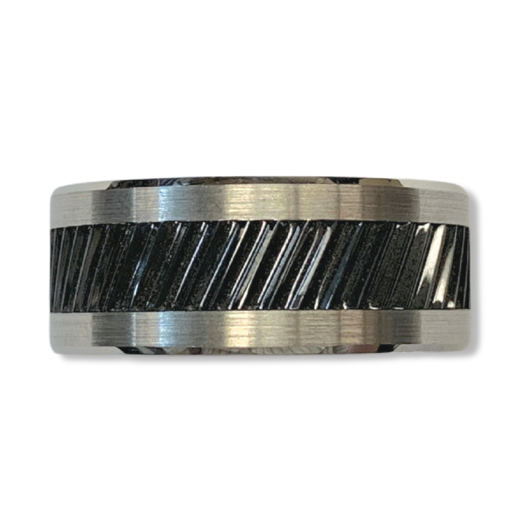 Polished Tungsten Ring with Gear Teeth Black Ceramic Inlay Size 11 Width: 10mm