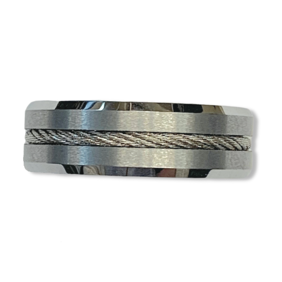 Tungsten Flat Ring with Steel Wire Cable Inlay and Beveled Edges Size12 8mm